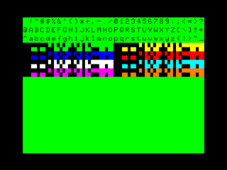 The alphanumeric display has two colorsets. The one used by default on the CoCo has black characters on a green background. The alternate has black characters on an orange background. The colorset selection does not affect semigraphics characters. The border in this mode is always black.